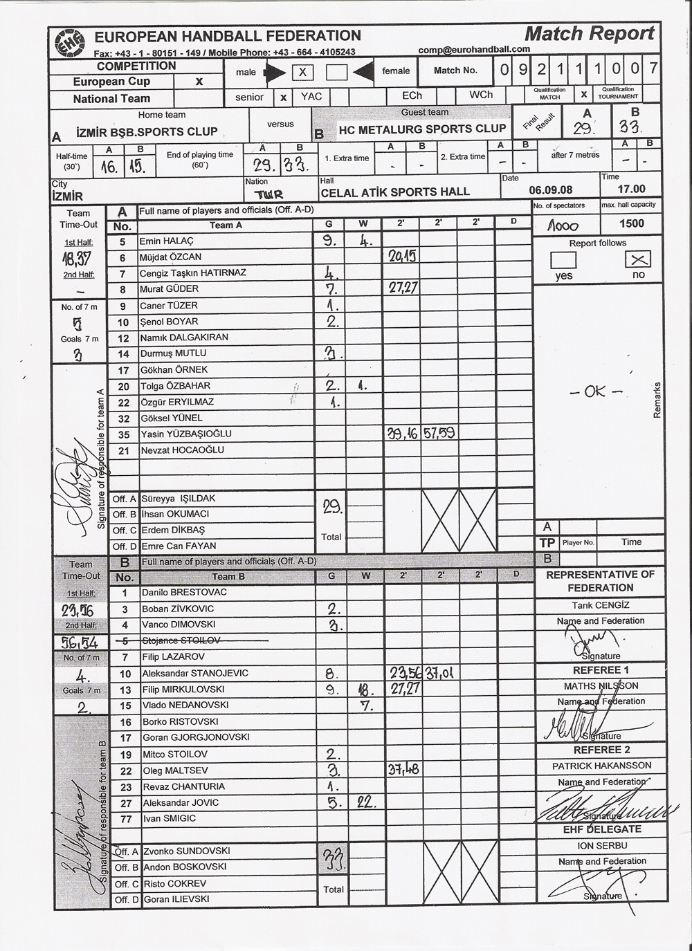 06.09.2008 CUMARTESİ SAAT :17.00 DE İZMİR'de OYNANAN İZMİR B.Ş.B. - HC METALURG HENTBOL MAÇI HAKEM VE GÖZLEMCİ RAPORU
